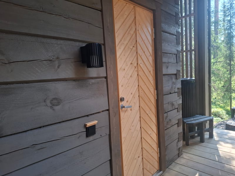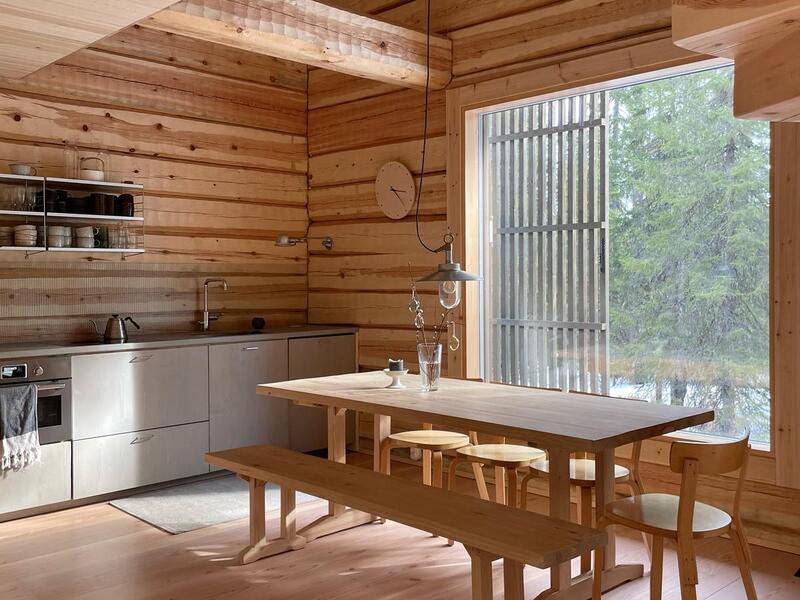 Aamu alkaa hiljaisuudella tässä yksityisessä mökissä. Kahvikin maistuu paremmalta, kun sen saa juoda vasta kirveellä veistetyn hirren keskellä.